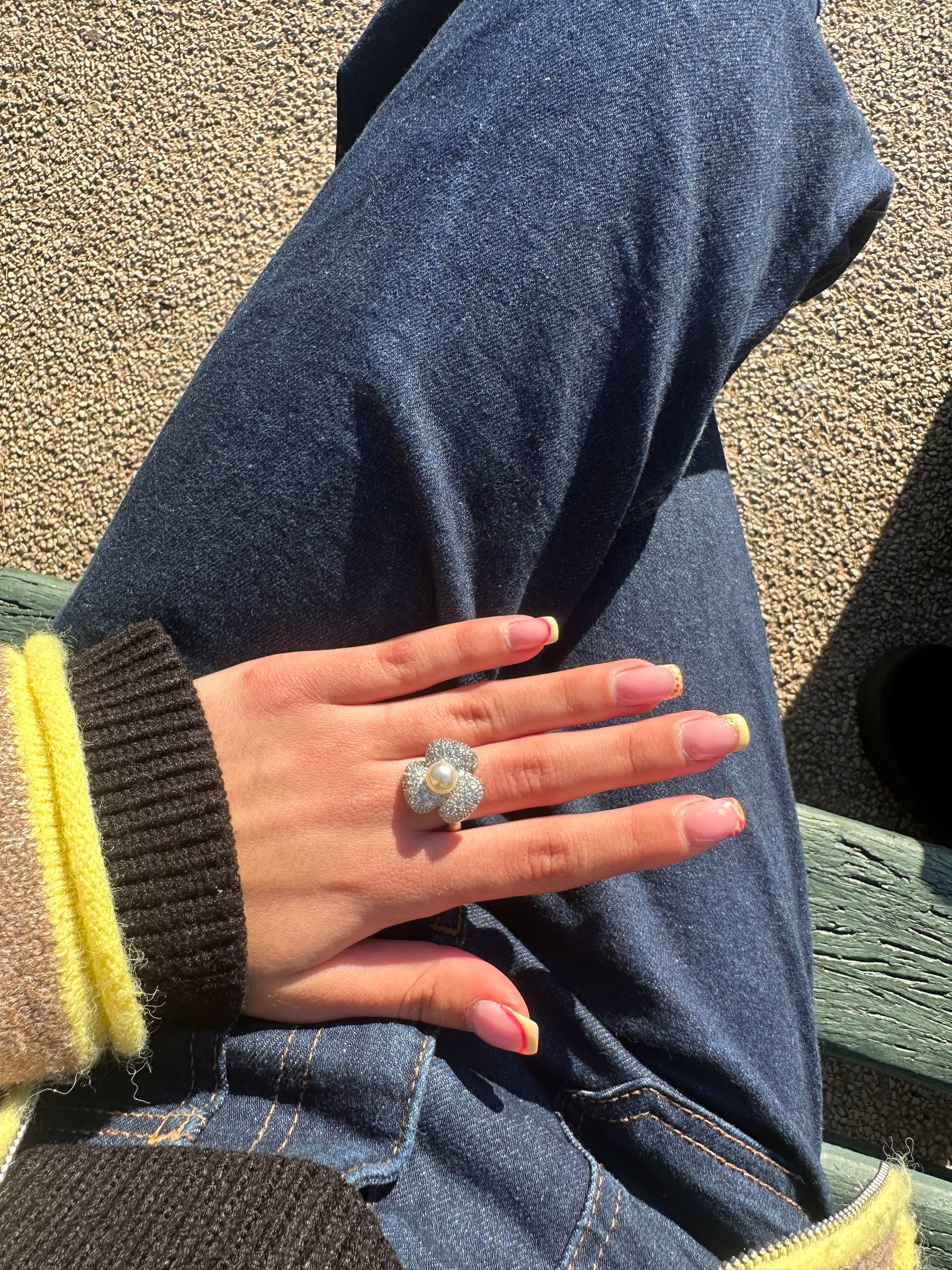 Bague ajustable en acier inoxydable en forme de fleur avec des strass sur les pétales et une perle au centre de la fleur