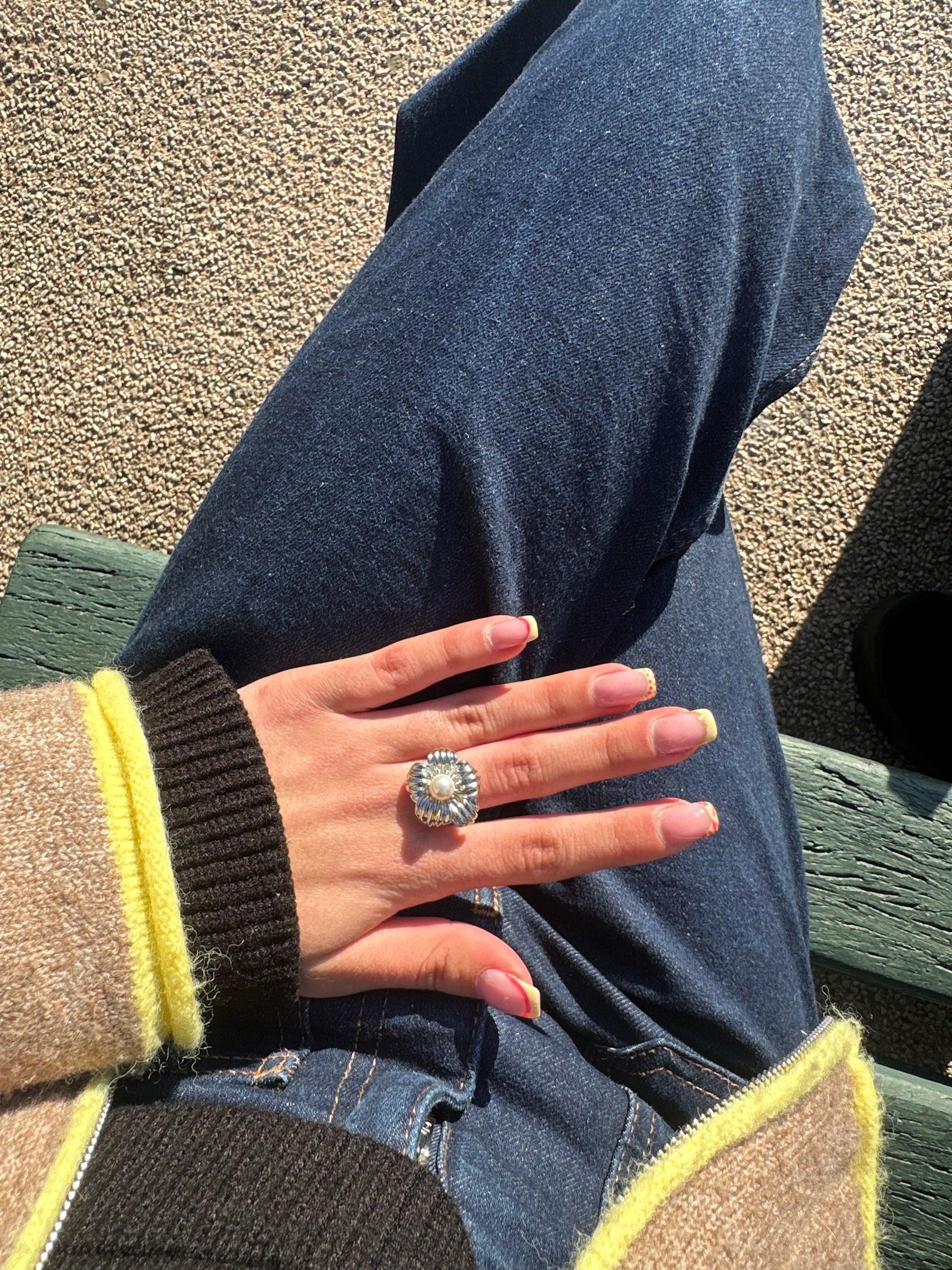 Bague ajustable en acier inoxydable en forme de fleur avec une perle au centre de la fleur