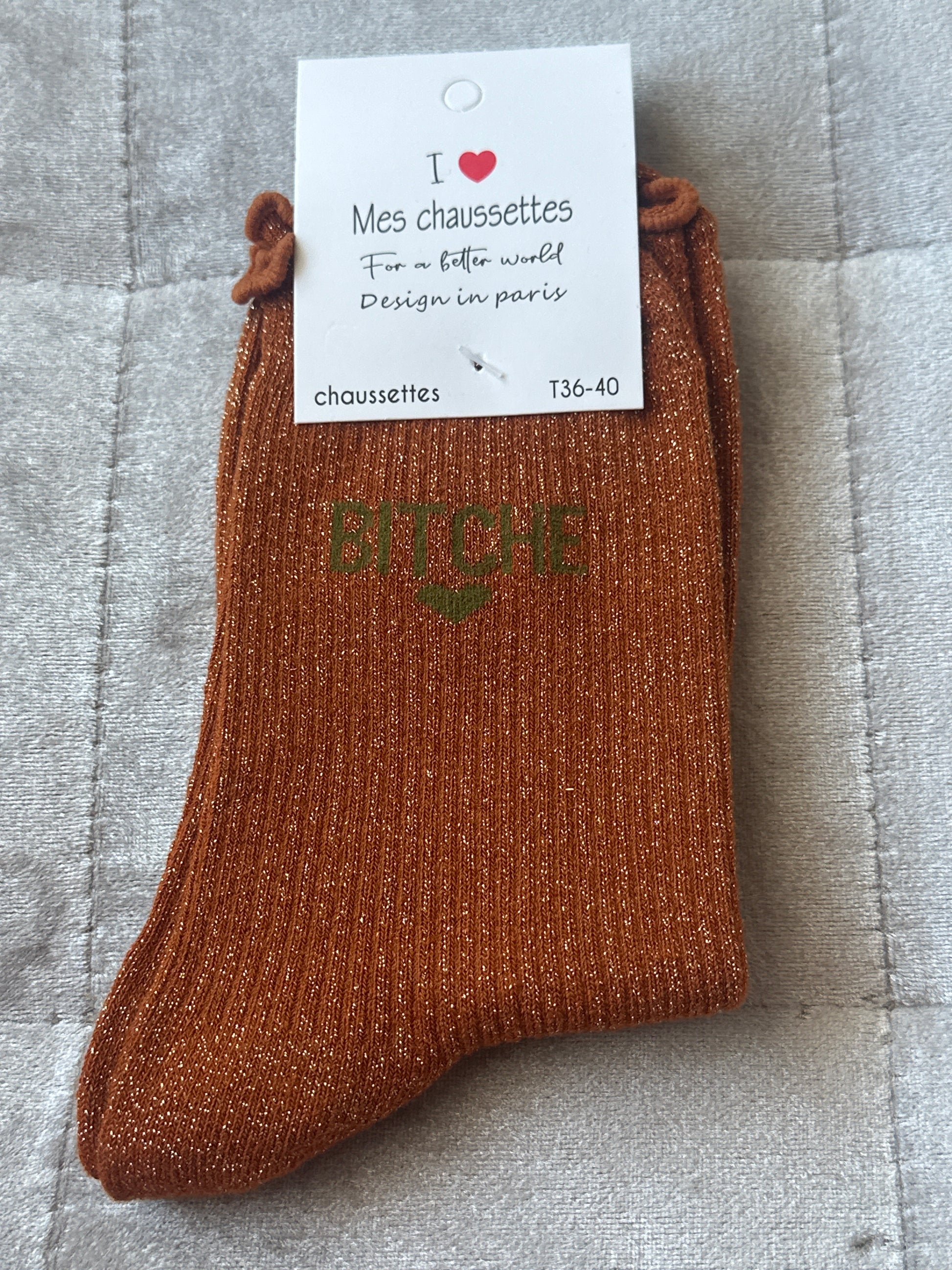 Chaussettes pailletées message « bitche »