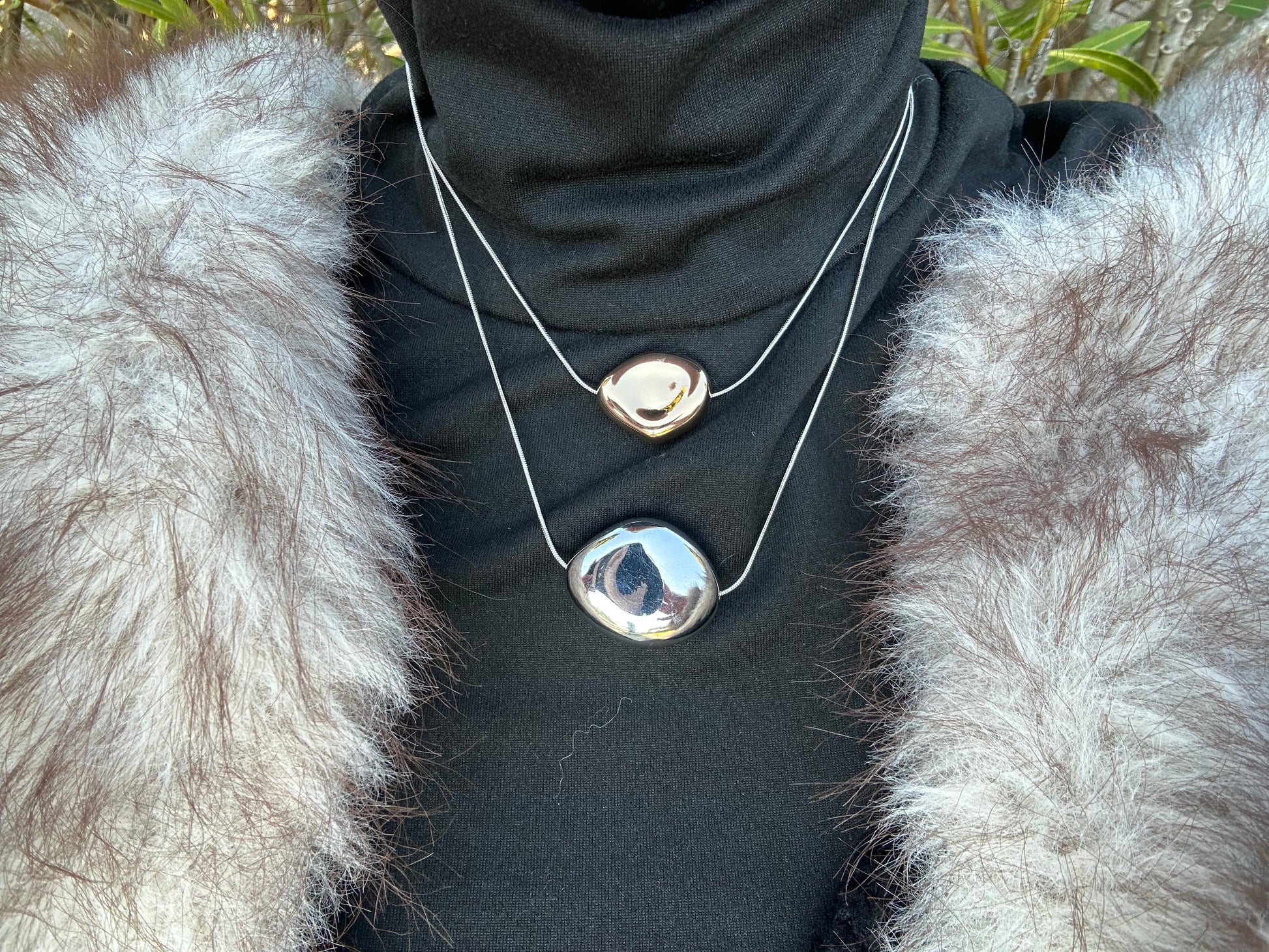 Collier double avec 2 pendantifs en forme de cailloux, chaîne en acier inoxydable et les 2 pendentifs sont en alliage