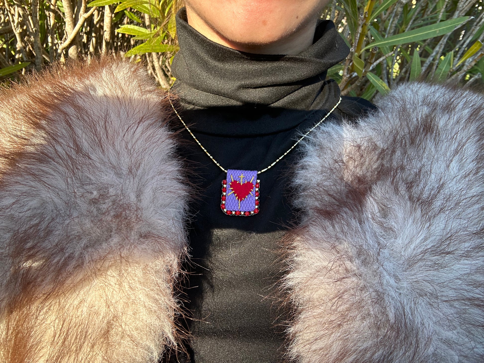 Collier en cuivre avec une petite pochette qui a un cœur en décoration