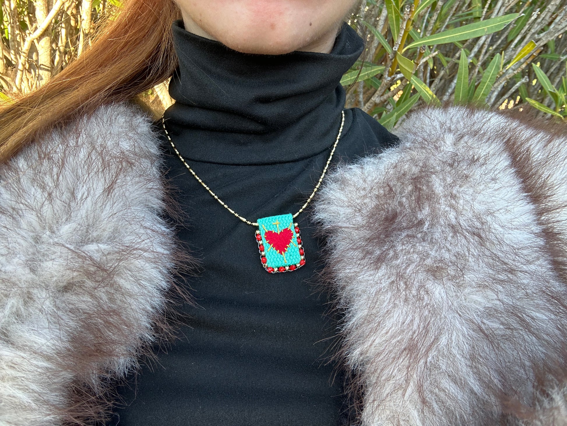 Collier en cuivre avec une petite pochette ayant un cœur dessus