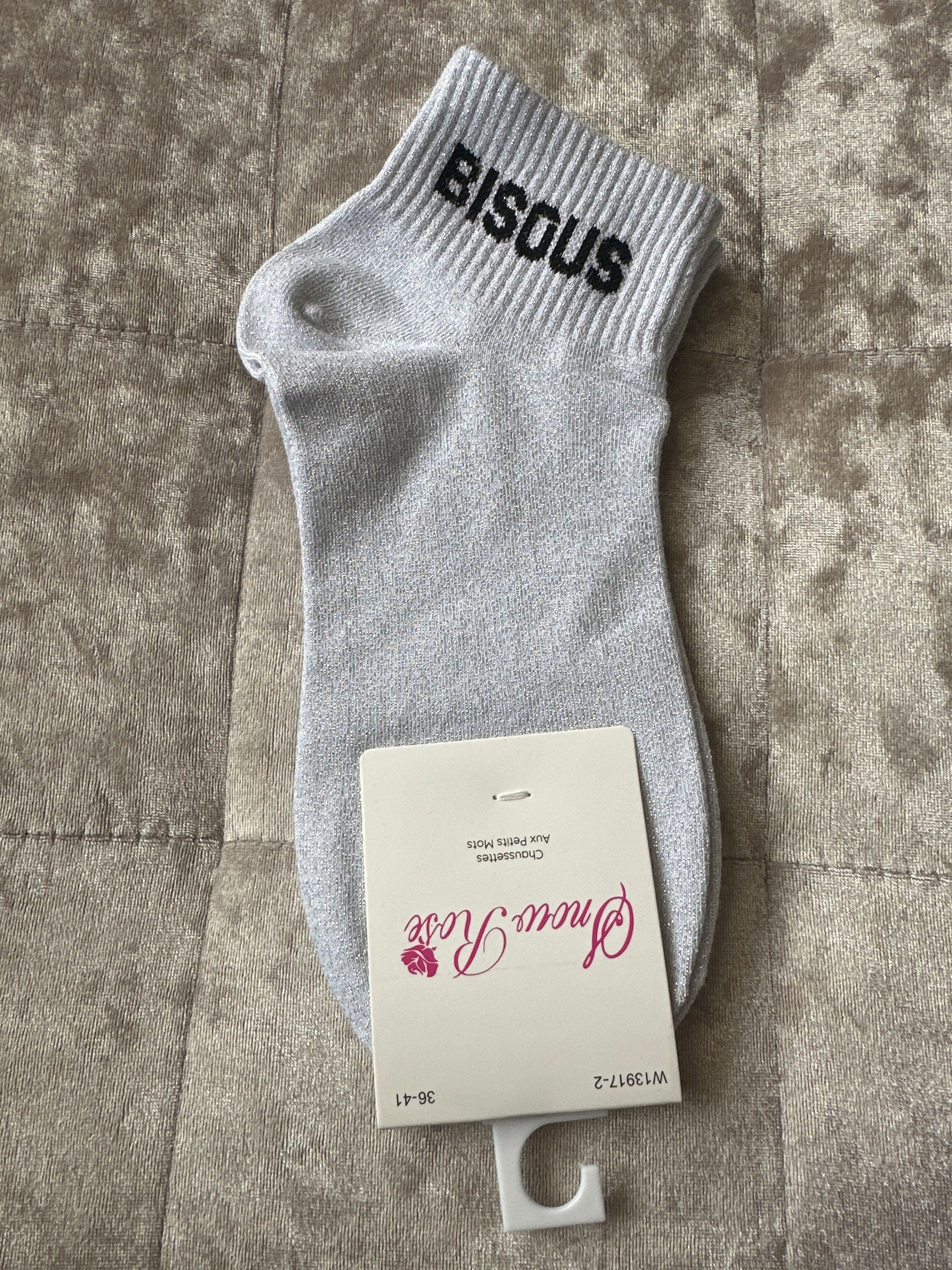 Socquettes pailletées message « bisous », taille 36-41, couleur blanc et argenté