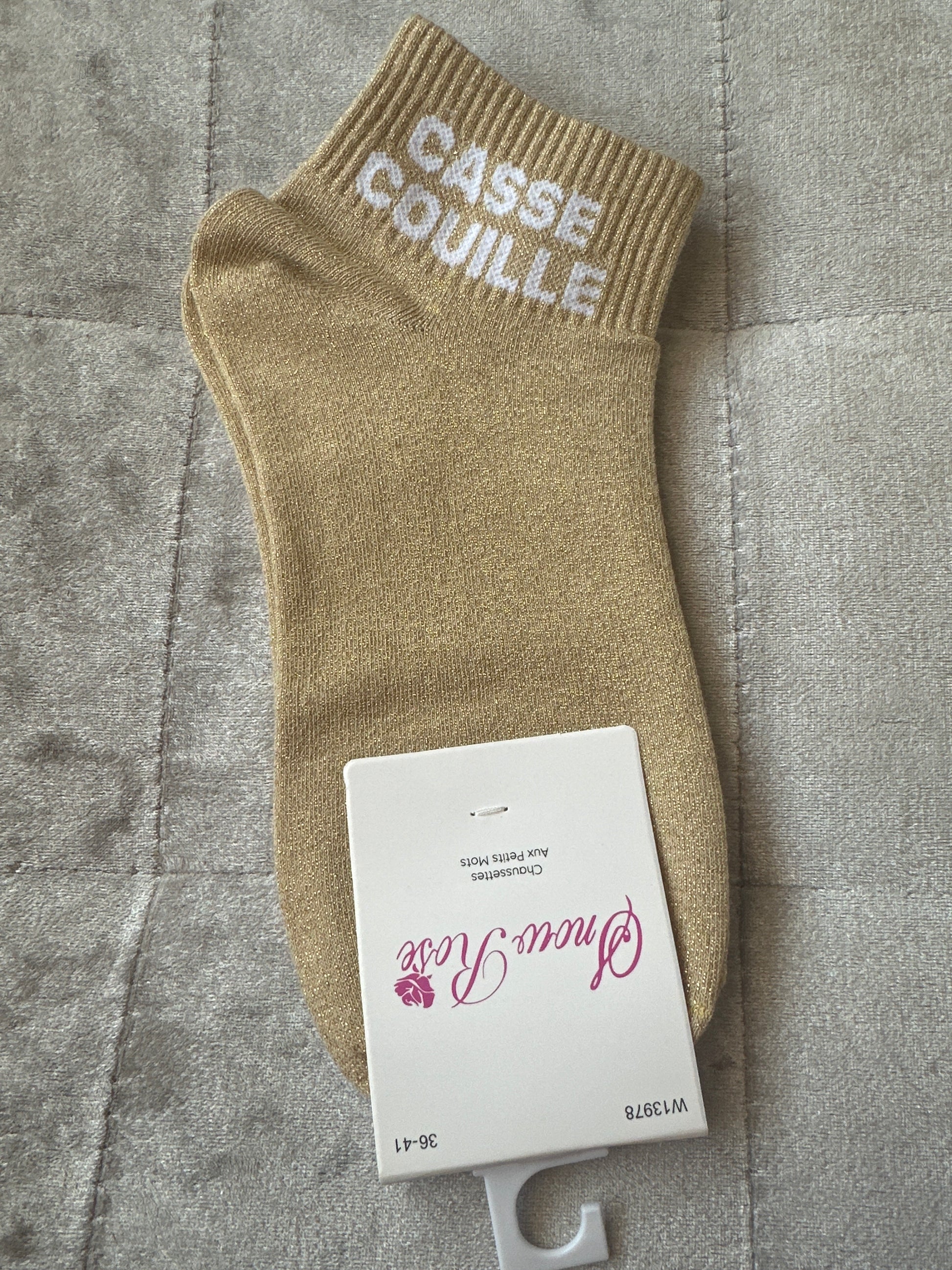 Socquettes pailletées message « casse couille », taille 36-41, couleur beige et blanc