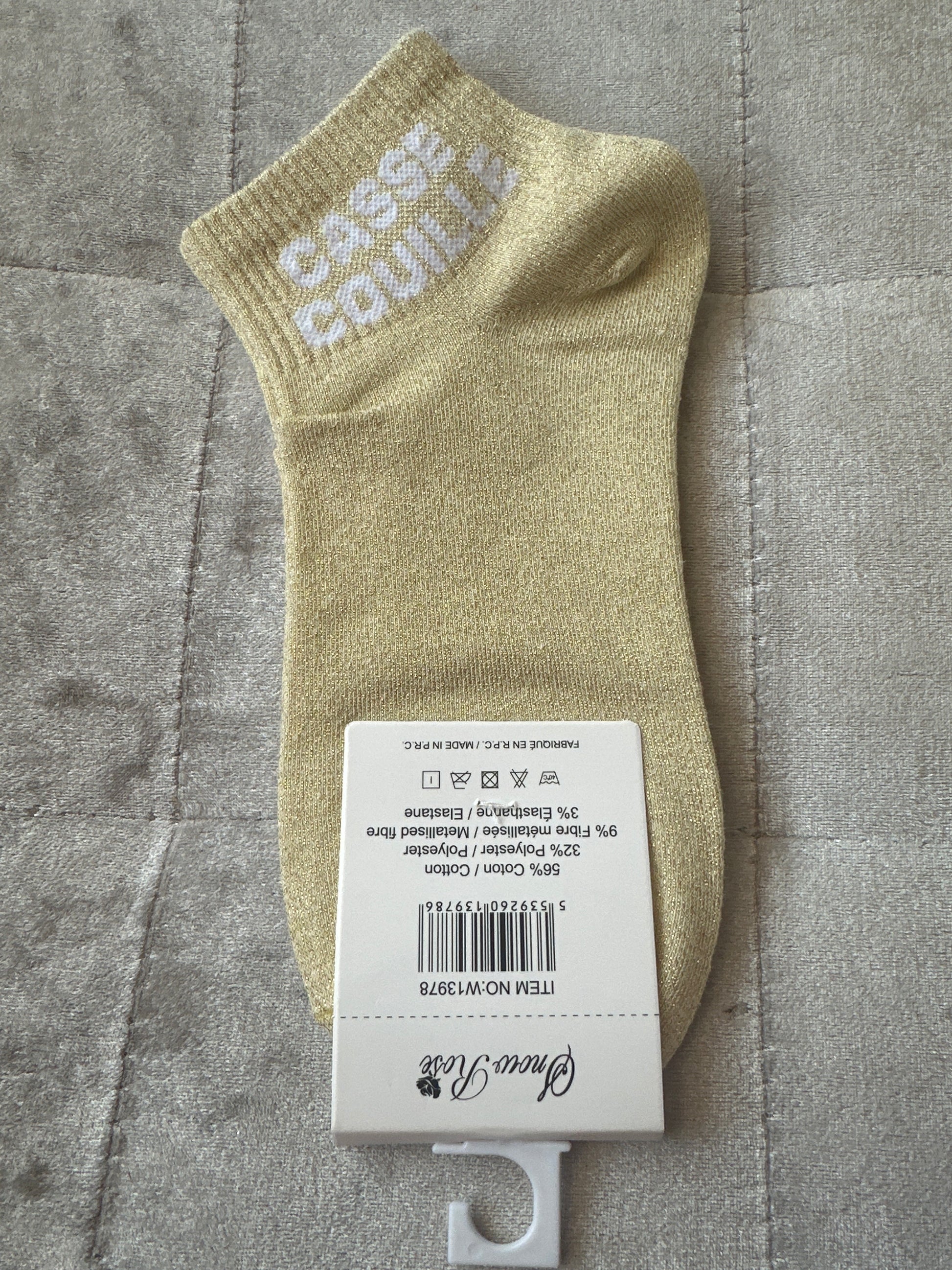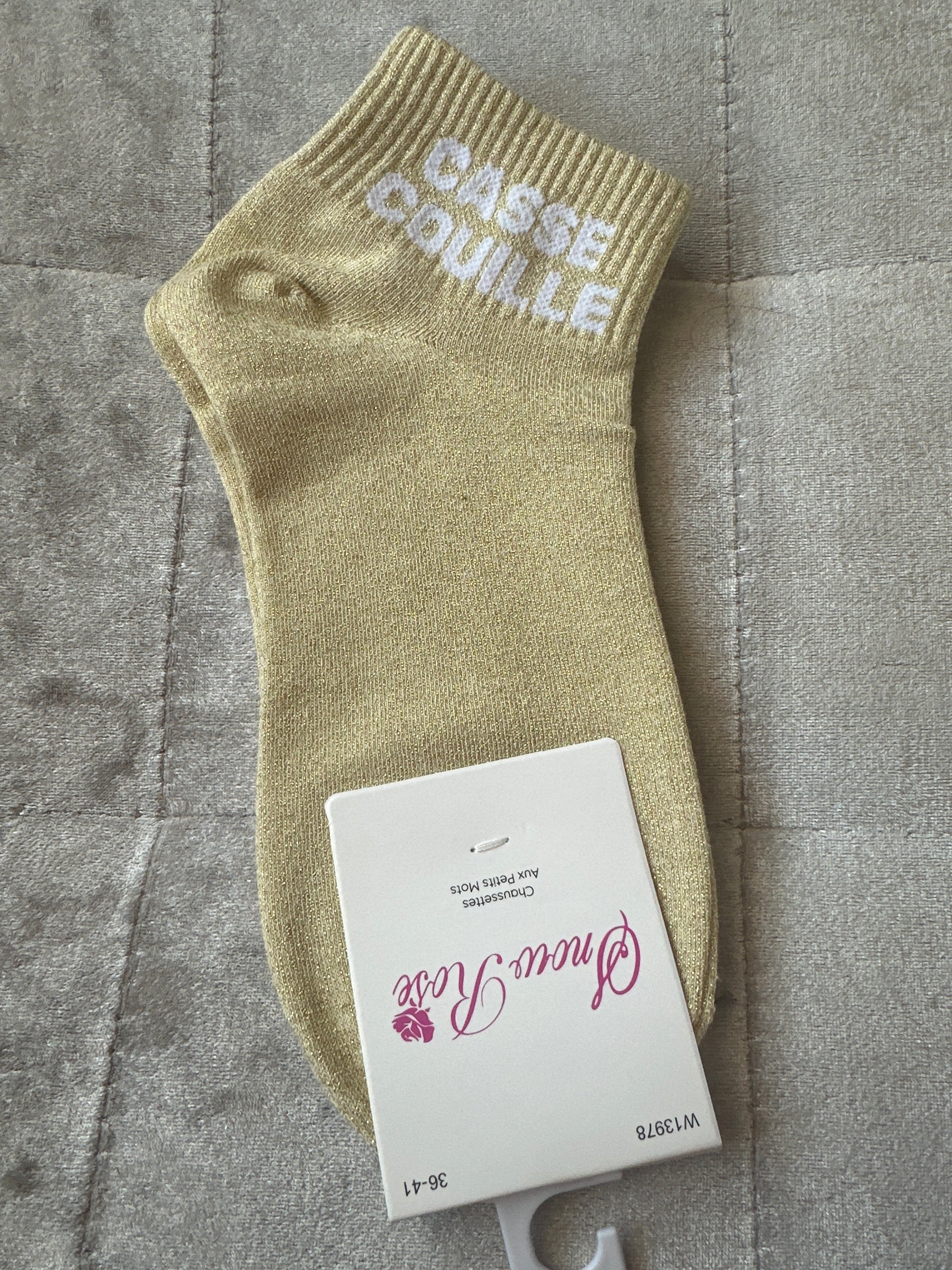 Socquettes pailletées message « casse couille », taille 36-41, couleur jaune et blanc
