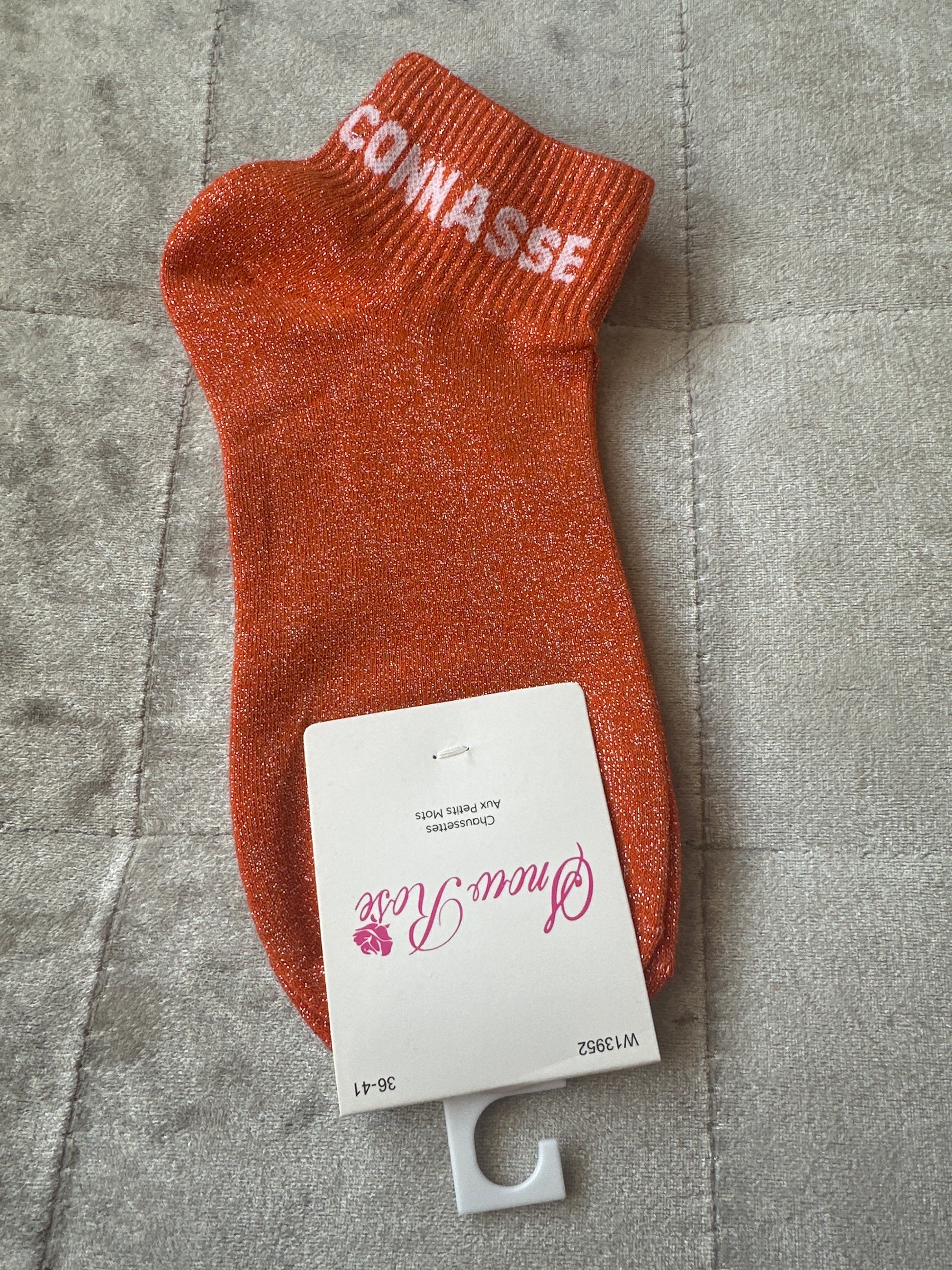 Socquettes pailletées message « connasse », taille 36-41, couleur orange et blanc