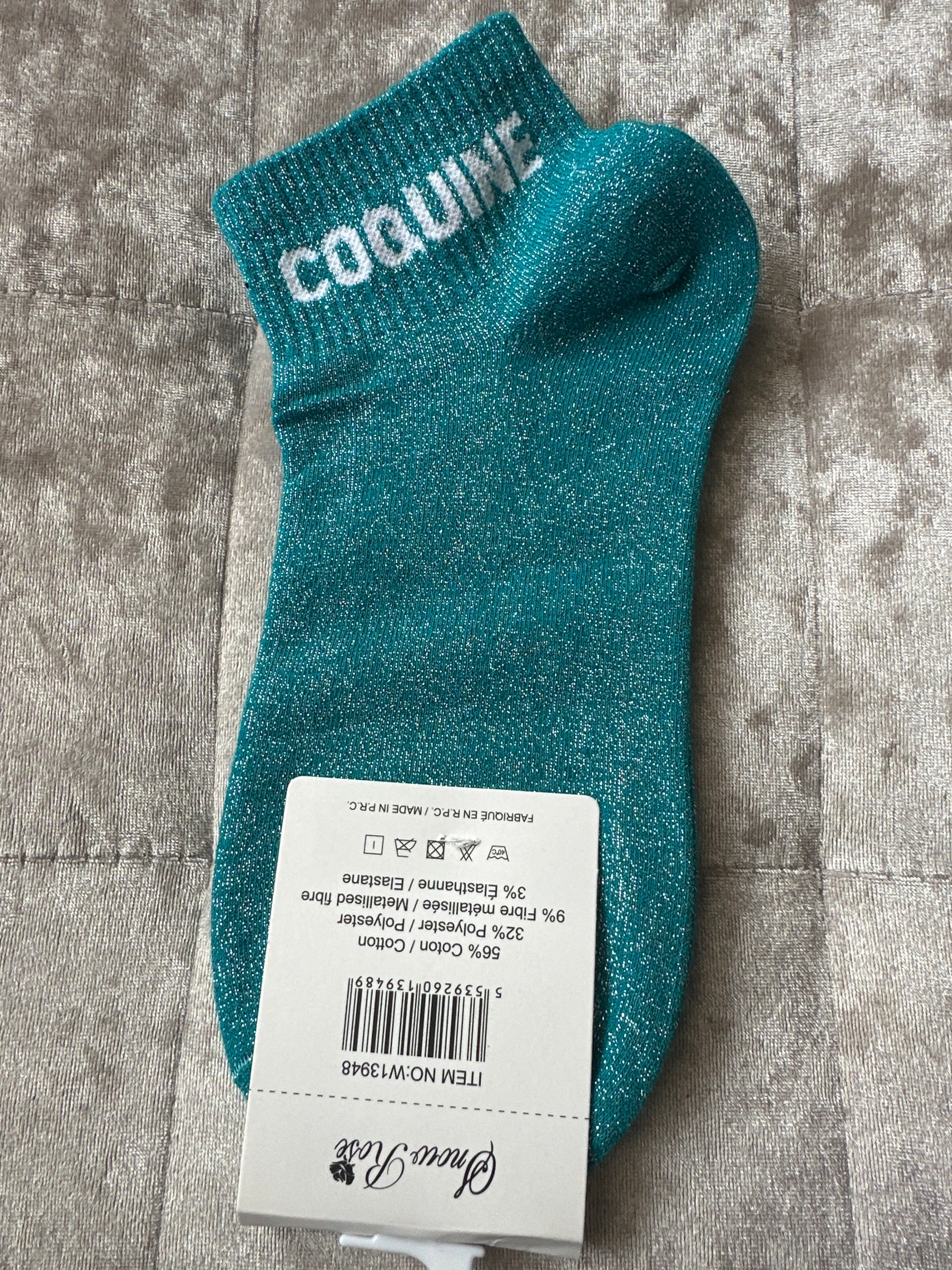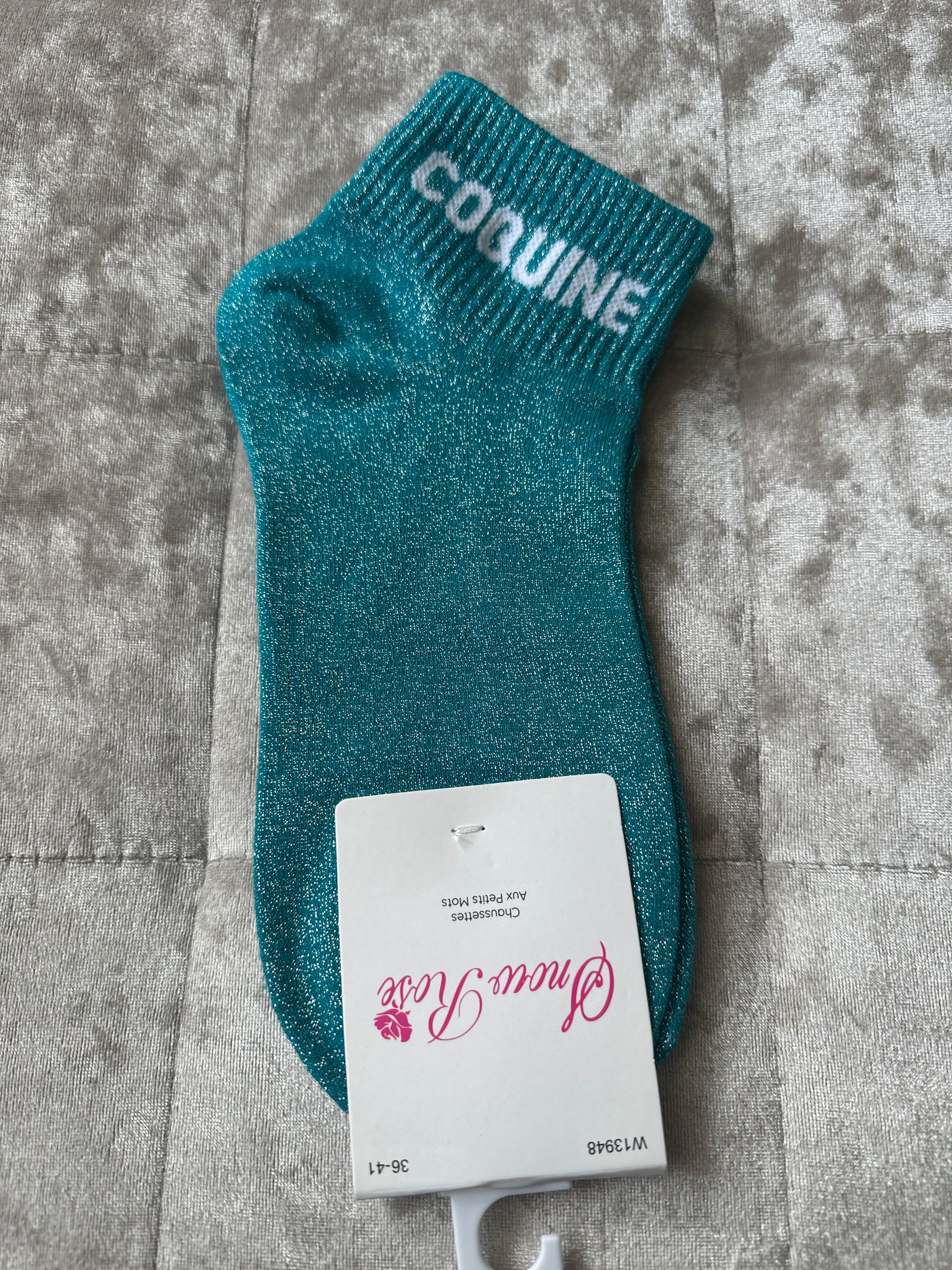 Socquettes pailletées message « coquine », taille 36-41, couleur turquoise et argenté
